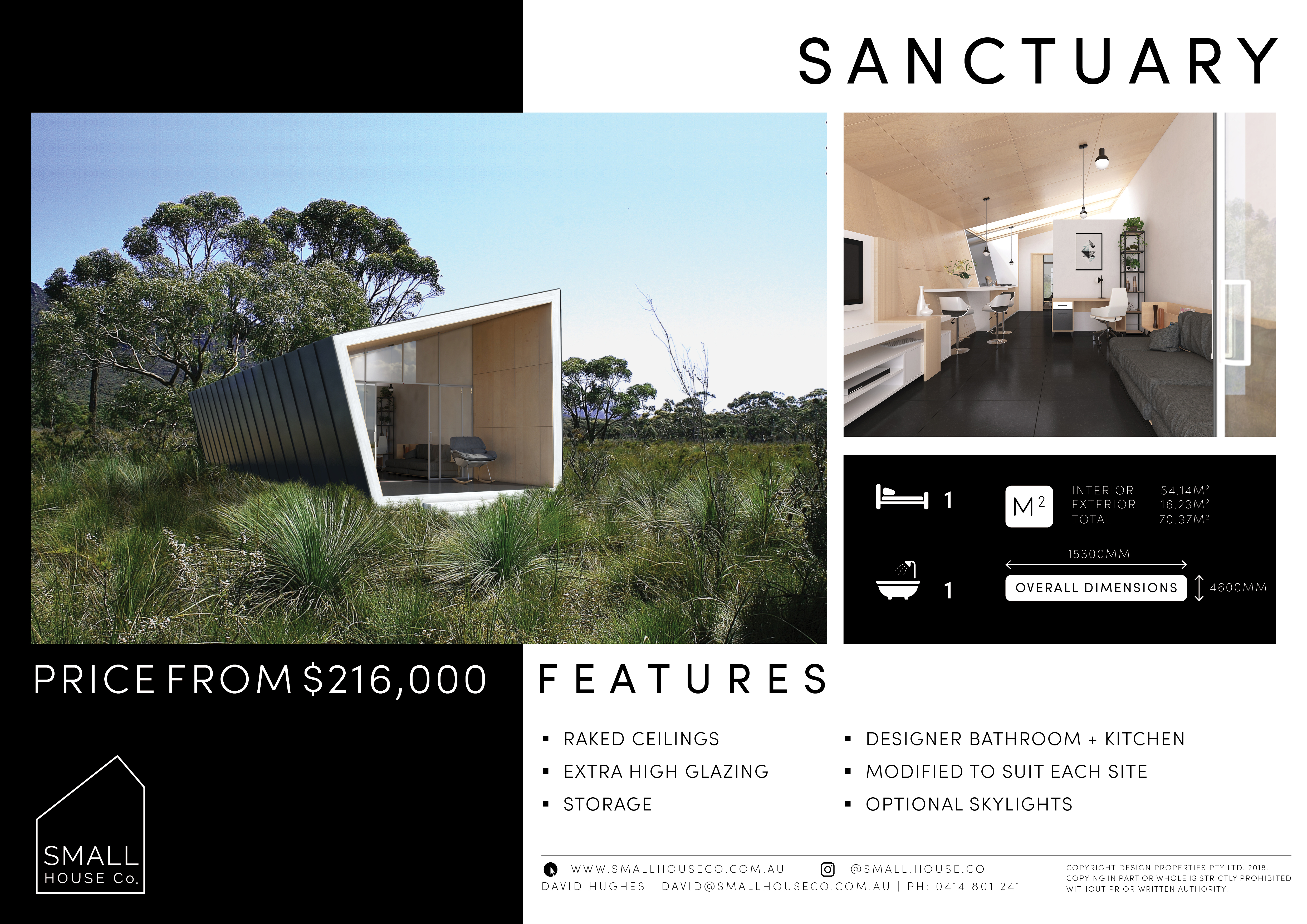 Unique use of light weight cladding and internal linings, combined with clever styling, makes the SANCTUARY an eye catching small home.